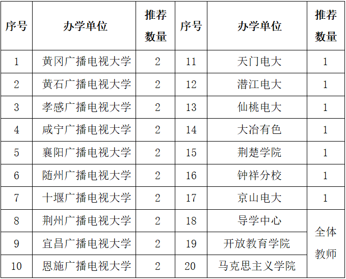 各市州电大负责做好统筹落实工作,选派体系优秀教师参加开放教育课程教学培训工作。具体安排见分配表: