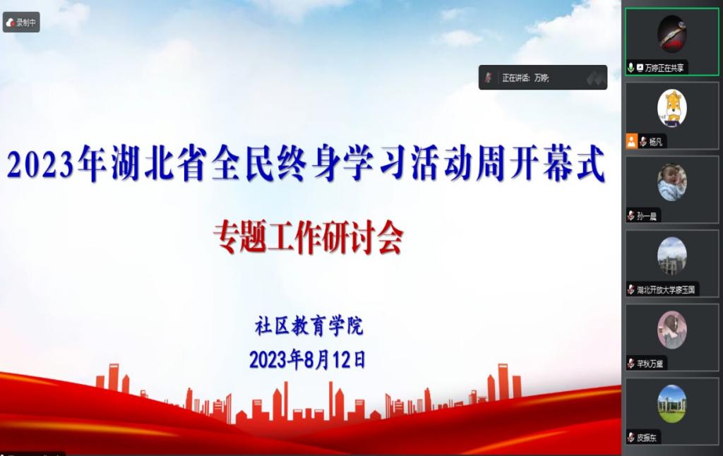 本网讯(通讯员 杨凡 文/图)为深入贯彻落实党的二十大报告关于“建设全民终身学习的学习型社会、学习型大国”精神,大力宣传终身教育活动,切实推动湖北全民学习、终身学习的学习型社会建设,8月12日,社区教育学院召开2023年湖北省全民终身学习活动周开幕式线上专题工作研讨会,会议由院长万婷主持,全体成员参加。
