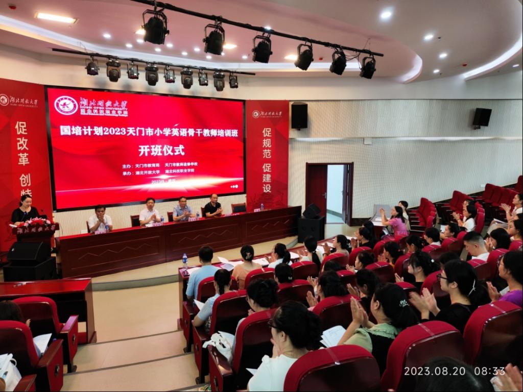 本网讯(通讯员 沈雁君/文 沈雁君 刘楚凡/图)8月20日上午,由天门市教育局、天门市教师进修学校主办,湖北开放大学承办的“国培计划(2023)”——天门市小学英语骨干教师培训班在湖北开放大学举行开班仪式。来自天门市的六十名参训学员齐聚报告厅,天门市教师进修学校副校长鲁天琼、工会主席熊万华,武汉东湖高新区教育发展研究院主任舒晓辉出席开班仪式。本次培训开班仪式由湖北开放大学开放教育学院、培训学院副院长刘茂财主持。