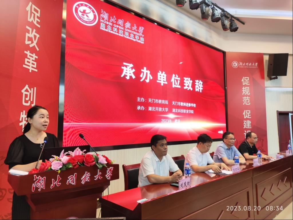 湖北开放大学开放教育学院、培训学院院长肖潇代表承办单位致欢迎辞。她对来自天门市的小学英语骨干教师的到来表示热烈欢迎,对天门市教育局、各级学校领导对教育事业的高度重视和对此次培训的大力支持表示感谢。她介绍了学校办学情况,平台优势,向学员们说明本次培训课程设置是通过多方调研,聚焦培训需求,经反复论证,既涵盖新政策解读、教师专业发展的课程,又有与小学英语教师教学环节密切相连的课堂设计、作业设计、教学研究等内容,并对训中、训后的学习支持服务作了说明。
