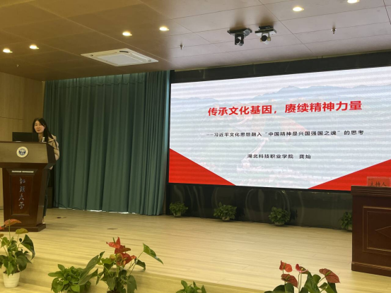 会上,各单位专家学者聚焦“习近平文化思想融入思政课”主题,通过线上线下相结合的方式开展研讨、集体备课。我校教师龚灿以“传承文化基因,赓续精神力量——习近平文化思想融入‘中国精神是兴国强国之魂’的思考”为题,从“精神之基——中华优秀传统文化是民族生生不息的丰厚滋养”“发展之力——中国共产党是中国精神的忠实继承者和坚定弘扬者”“青春之行——中国精神代代传”三个角度进行了习近平文化思想融入思想道德与法治课程的教学展示。武汉城市职业学院马克思主义学院院长彭国平教授进行了有针对性的点评。
