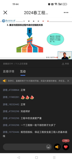 本网讯(通讯员 程夏静 文/图)“为什么清廉是工程招投标阶段与合同管理阶段造价控制不可或缺的一部分?”5月25日晚上,导学中心刘朝老师的《工程造价控制》直播课开讲。