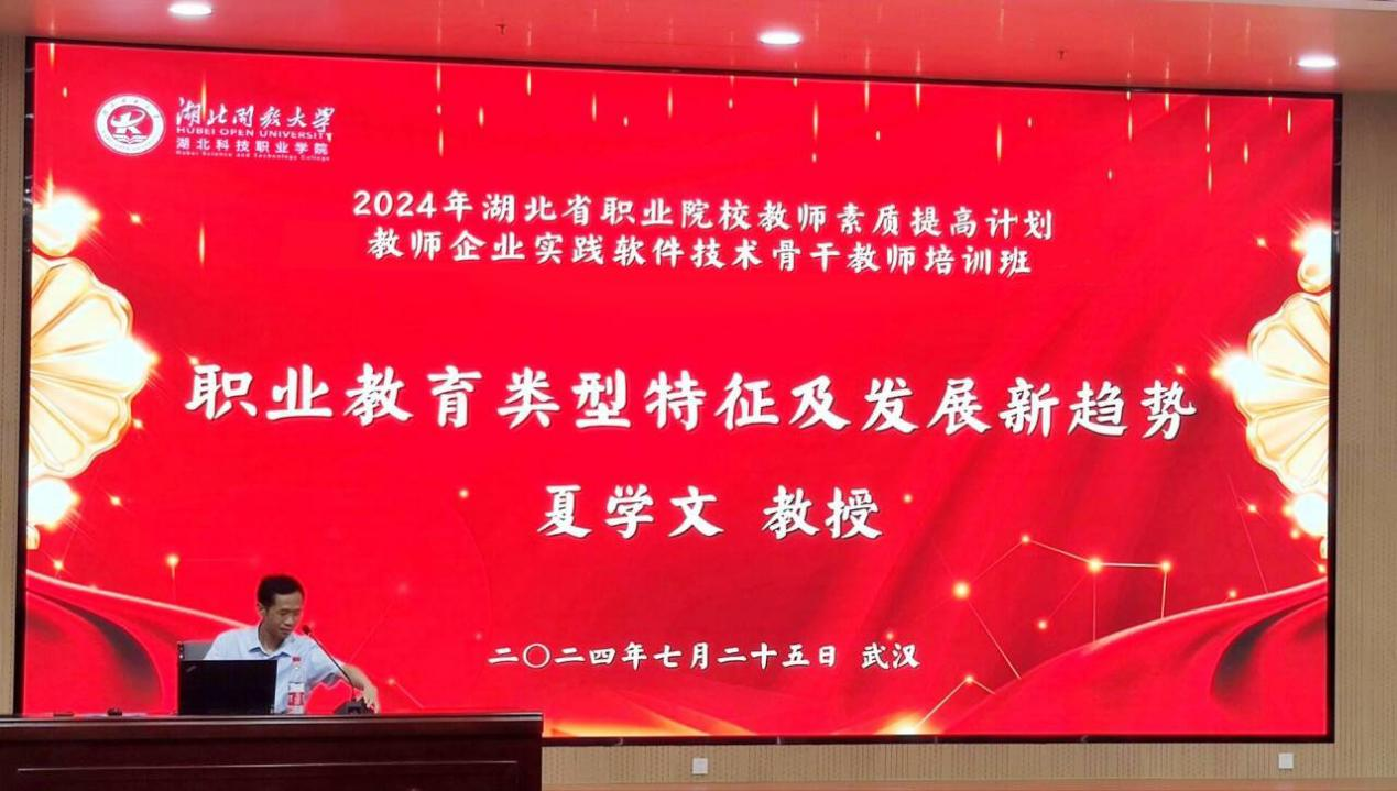 本网讯(通讯员 董燕燕/文 余静/图)7月25日上午,副校长、知名职教专家夏学文教授在学校实训楼学术报告厅为“2024年湖北省职业院校教师素质提高计划教师企业实践软件技术骨干教师培训班”的学员们作“职业教育类型特征及发展新趋势”主题交流分享。夏学文梳理了从1949年开始至今职业教育的发展历程,并通过案例从“职业教育的类型特征、政策导向、职教体系建设以及湖北探索实践”四个方面进行了深入的剖析和讲解,迎来教师们的阵阵掌声。