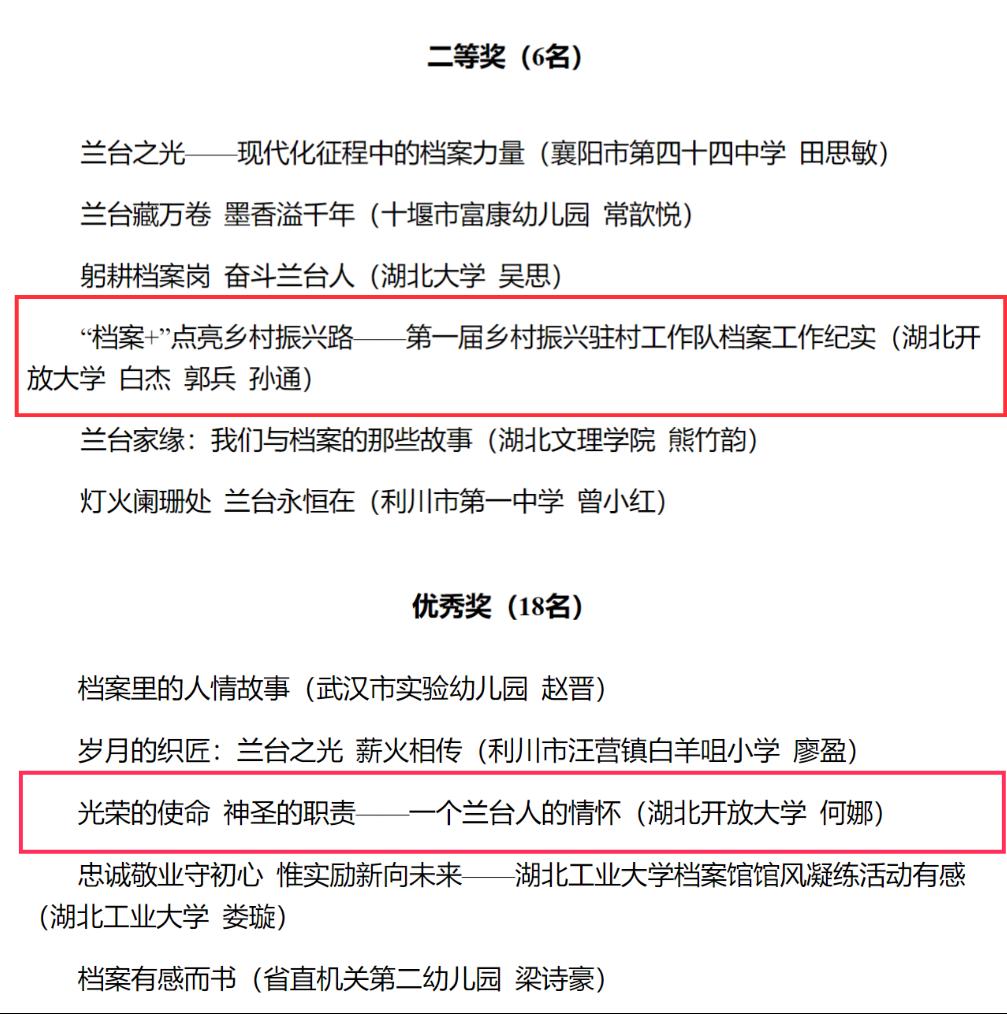 本网讯(通讯员 罗小路 文/图)近日,由省档案局、省档案馆组织开展的“筑梦现代化 奋斗兰台人”主题征文活动落下帷幕,活动覆盖全省各市、州、县档案局、档案馆,省直各单位、各高等学校、各大型企事业单位档案部门,共收到征文2672篇,学校类设一等奖3名、二等奖6名、三等奖9名、优秀奖18名。我校档案馆推送的作品《“档案+”点亮乡村振兴路——第一届乡村振兴驻村工作队档案工作纪实》获得二等奖,《光荣的使命 神圣的职责——一个兰台人的情怀》获得优秀奖。这是我校首次在该赛事中获得荣誉。