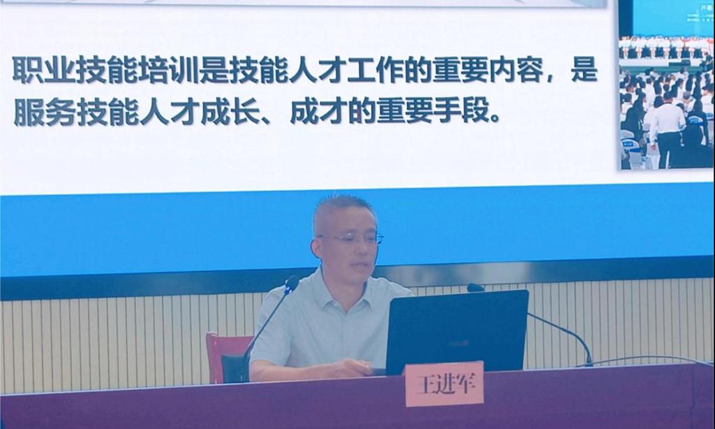 王进军的报告从职业技能培训的意义、相关支持政策、发展前景三个方面展开,他指出高技能人才是国家竞争力的重要支撑,而职业技能培训则是培养高技能人才的关键途径。职业技能培训前景广阔,围绕职业院校如何开展职业技能培训王进军提出了具体建议:一是开展职业技能培训应与就业创业相结合,深化校企合作,对接行业部门,服务产业发展;二是与教学教研相结合,培养教师,完善教材,加强基础设施投入;三是与人才评价相结合,依据相关意见实施职业技能等级认定;四是与技能竞赛相结合,构建完善的技能竞赛体系,提升培训教学水平,培养优秀选手,锻炼双师型教师队伍。