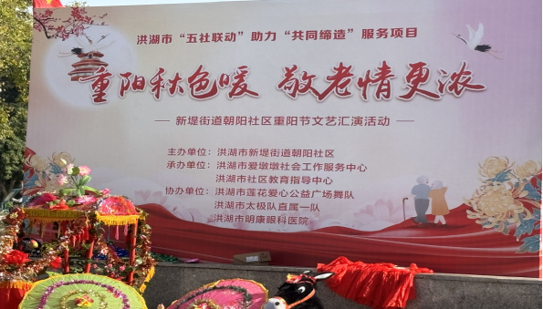 洪湖市新堤街道朝阳社区开展了“重阳秋色暖 敬老情更浓”重阳节文艺汇演活动,为社区老年人提供丰富多彩的精神文化生活。通过这次活动,朝阳社区将继续秉承“共同缔造”的理念,深化“五社联动”服务项目,为居民提供更加贴心、周到的服务,共同建设美好家园。