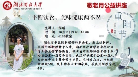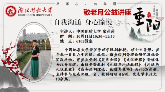10月11日重阳节,学院聚焦提高老年学员健康意识和文明素养,开展《平衡饮食,美味健康两不误》、《自我沟通身心愉悦》线下公益讲座活动。进一步倡导主动健康生活方式,并以优秀的人际沟通与和谐家庭关系,增进自我认知、调节情绪,提高自我效能,促进代际和谐共荣。