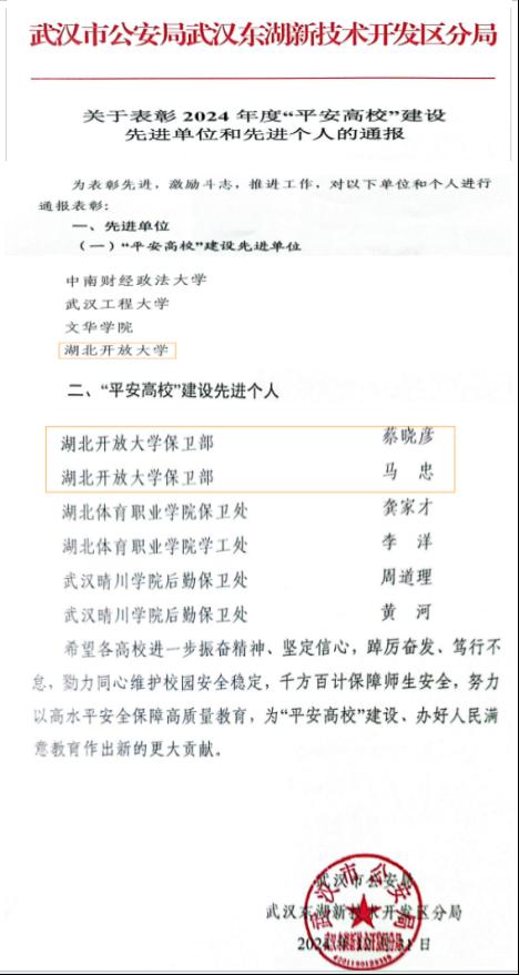 本网讯(通讯员 马忠 文/图)近日,武汉市公安局武汉东湖新技术开发区分局通报,我校荣获2024年度“平安高校”建设先进单位,保卫部两名同志荣获“平安建设”先进个人。