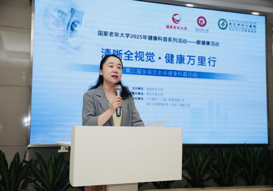 肖潇代表学校致辞,她表示,学校积极落实省委、省政府赋予的“服务湖北全民终身学习和学习型社会建设”职责,深入践行“德学康乐为”办学宗旨,将老年主动健康教育纳入老年教育服务体系,通过院校合作,为老年人健康保驾护航。湖北开放大学以“爱眼日”为契机,联合武汉市中心医院、卡尔蔡司(上海)管理有限公司等专业机构,构建“科普讲座+义诊检查+健康指导”的全方位服务平台,旨在借助专业力量破除认知误区,帮助老年人树立科学眼健康理念,更好地满足老年群体多样化、个性化学习需求。