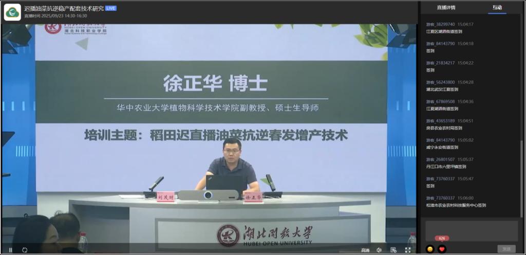 全省各市(州)、县的基层农技推广员、实验示范基地技术人员、油菜种植户及其他从事相关产业工作的人员参加了本次网络专题培训,约1000人通过直播观看学习,培训反响热烈。后期我校将会在湖北省农业科技人才办公室的指导下,继续开展农业主推技术专题培训,为服务湖北乡村振兴贡献开大力量。