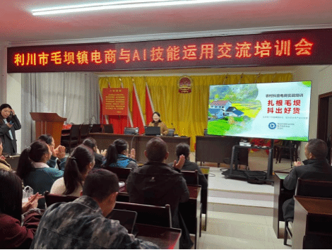 本网讯(通讯员 王玉红/文 邓红/图)近日,受学校对口帮扶的恩施利川毛坝镇镇政府邀请,在学校驻村工作队的积极协调安排下,湖北开放大学工商管理学院电子商务专业邓红、王玉红两位老师前往毛坝镇,开展电商与AI应用技能专题培训。本次培训的参训人员涵盖毛坝镇镇政府工作人员、各村“两委”村干部、乡镇企业负责人及电商爱好者等,共计120余人参与。