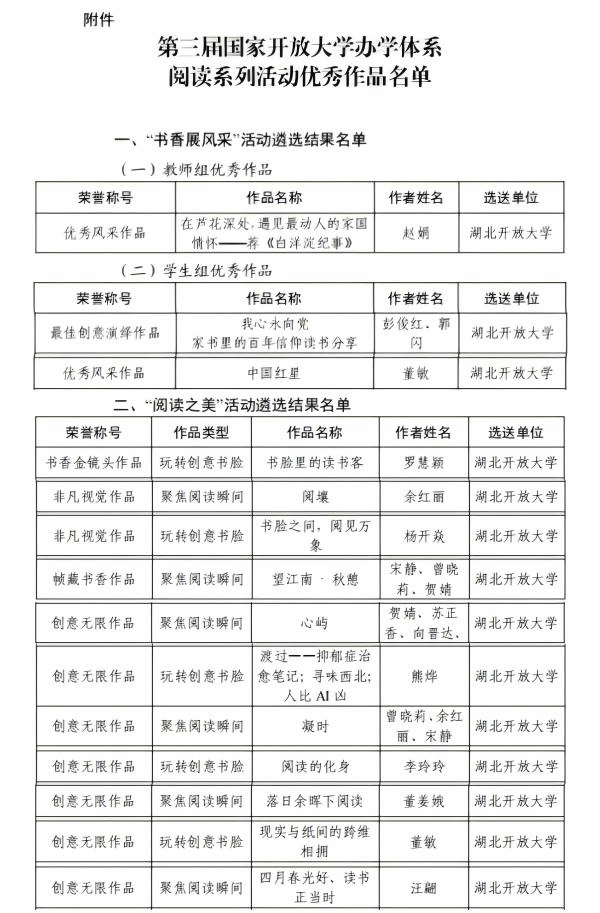 本网讯(通讯员 尹锦育 文/图)近日,第三届国家开放大学办学体系阅读系列活动优秀作品名单正式公布,我校共14个作品获奖,学校荣获“优秀组织单位”称号。