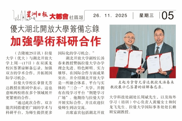 在马来西亚拉曼大学,双方围绕“地域文化研究的学术价值与课程转化”举行圆桌论坛并展开深入探讨。基于共识,双方正式签署合作协议,未来将开展国际科研项目和联合人才培养,深化学术交流,积极推进教师互访、学生交流实习等活动。拉曼大学校长尤芳达表示,双方的学术理念高度契合,期待通过联合研究为马来西亚与中国的教育文化交流提供学术支撑。此外,汤春来在拉曼大学以“何以‘荆楚’从长江之畔到南洋之约”为题作专题讲座,凭借深厚的学术积淀与生动的案例分析,赢得在场师生的热烈反响。