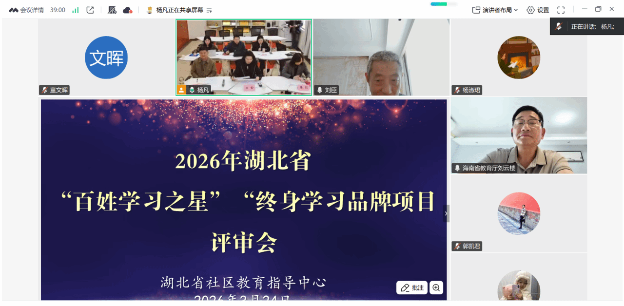 本网讯(通讯员 杨凡/文 贾小琴 原扬 童文晖/图)为进一步挖掘湖北终身学习典型,打造终身学习品牌项目,营造全民终身学习氛围,3月24日,湖北省社区教育指导中心召开2026年湖北省“百姓学习之星”“终身学习品牌项目”评审推介会,对市(州)初评推介项目进行省级复评。