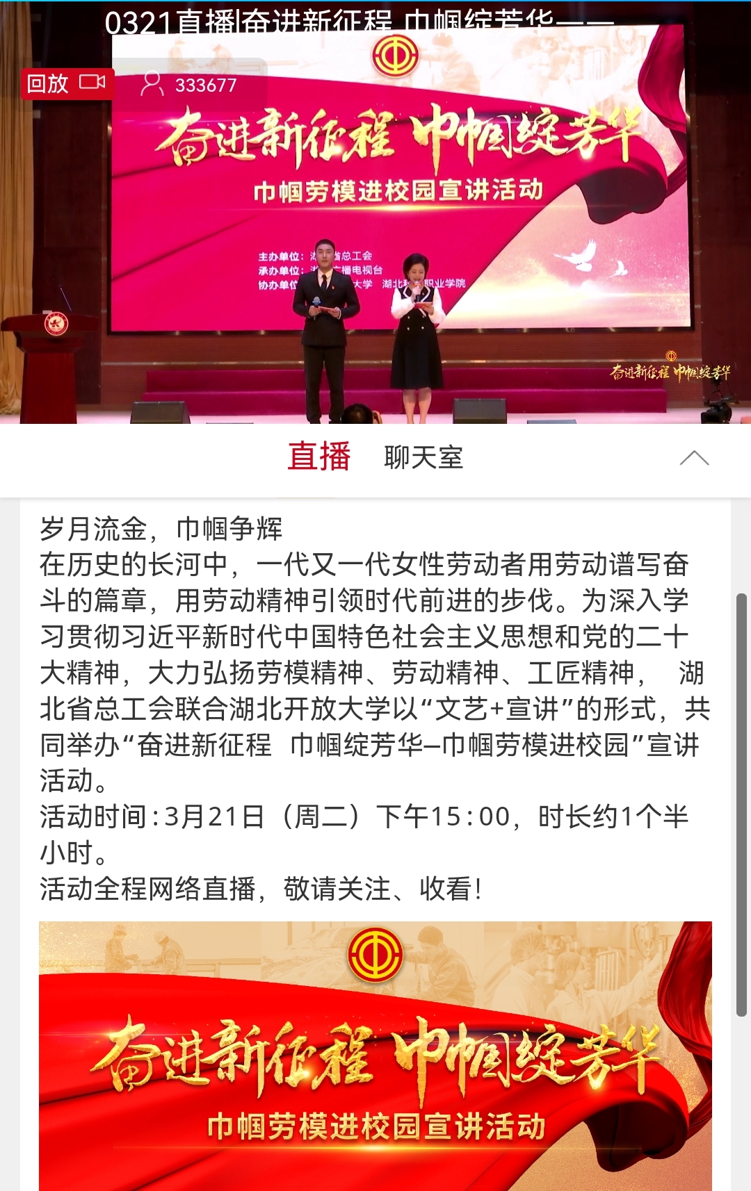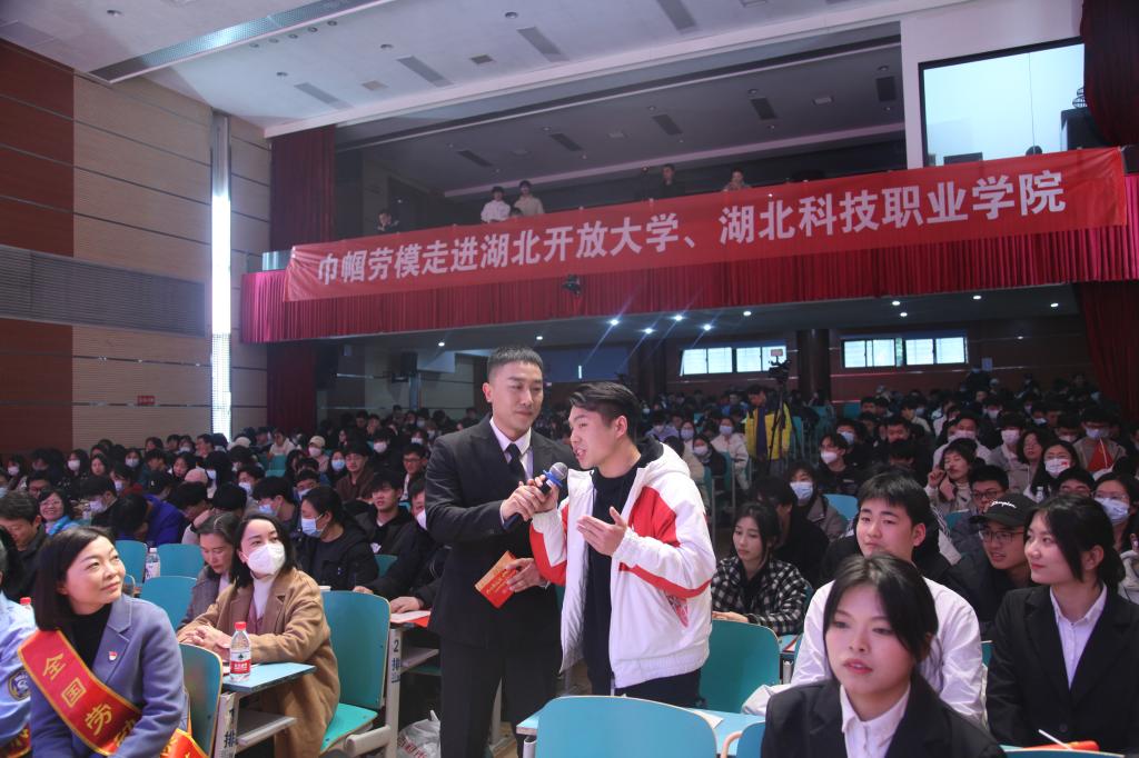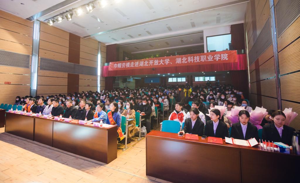 宣讲会上,湖北开放大学校领导张化斌为四位巾帼劳模佩戴绶带以及颁发工匠精神实践导师聘书。现场还进行了《奋进新征程 巾帼绽芳华》文艺汇演。整场宣讲活动既弘扬了劳模精神、劳动精神、工匠精神,又展现了当代大学生朝气蓬勃的生机,让青春在全面建设社会主义现代化国家的征程上绽放绚丽之花。
