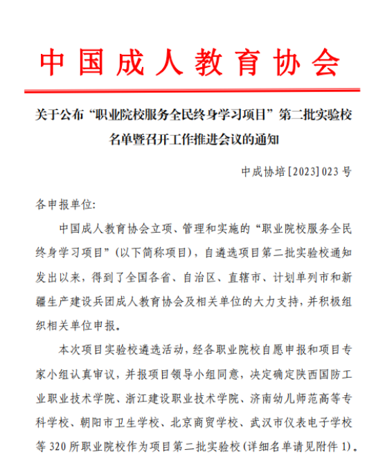 本网讯(通讯员 杨凡 文/图)5月24日,中国成人教育协会公布“职业院校服务全民终身学习项目”第二批实验校名单(中成协培〔2023〕023号),我校社区教育学院组织申报并成功获批了42所职业院校(高职26所、中职16所),获批数位列全国第二。