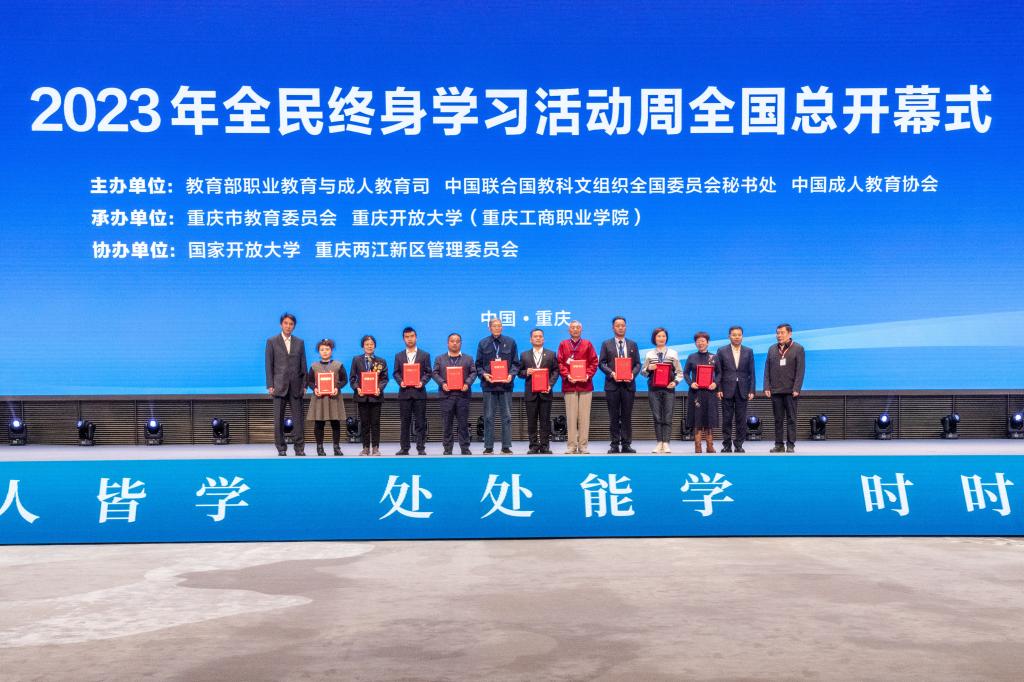 本网讯(通讯员 陈佳 文/图)11月14日,2023年全民终身学习活动周全国总开幕式在重庆举行,我省“事迹特别感人的百姓学习之星”获得者、“特别受百姓喜爱的终身学习品牌项目”负责人受到表彰。湖北省教育厅二级巡视员何爱军、职成处处长余弢,学校副校长汤春来、社区教育学院院长万婷受邀参加开幕式。