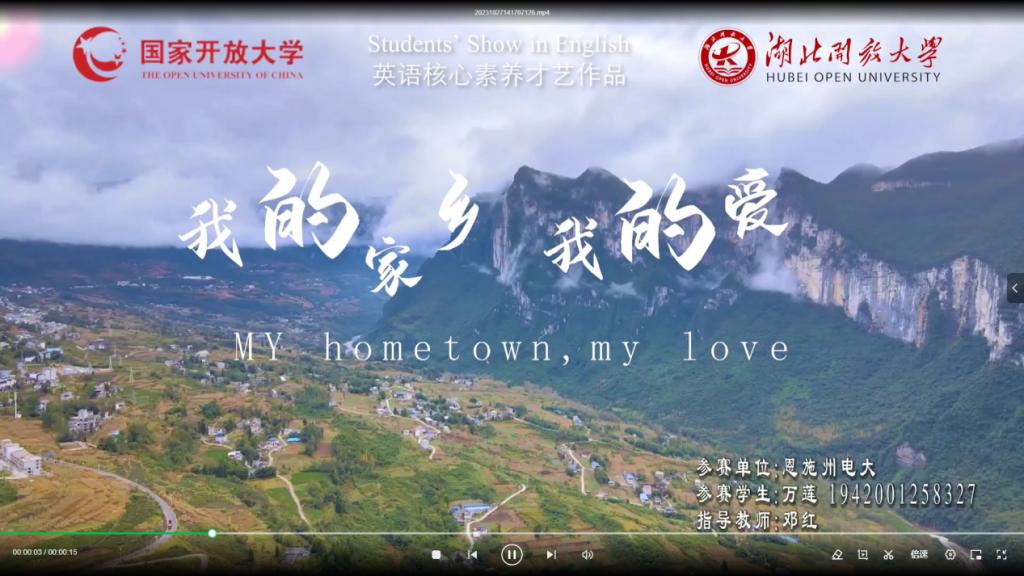 本网讯(通讯员 胡恒 文/图)11月30日,国家开放大学英语核心素养才艺作品评比结果公布,我校推荐的参赛英语视频短片《我的家乡我的爱》(My Hometown My Love),在全国138项参赛作品中脱颖而出,荣获一等奖。该作品由我校“人工智慧赋能英语”试点教学改革团队成员、恩施分校邓红老师指导、学生万莲参与拍摄。