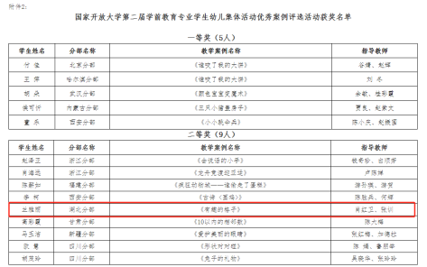 本网讯(通讯员 程雪丹 熊婷/文 程雪丹/图)近日,国家开放大学2023年学前教育专业学生优秀作品评选活动结果公布,全国共收到学前教育专业学生幼儿集体活动优秀案例作品46份,我校学生兰雅丽和易文静的作品在此次评选活动中分别荣获二等奖和优秀奖。