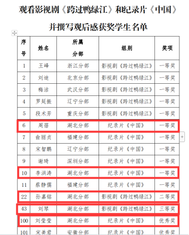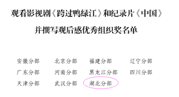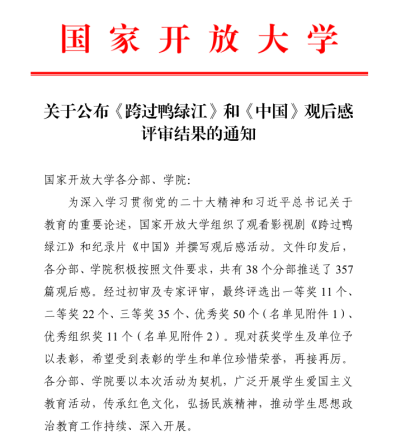 本网讯(通讯员 徐蕾/文 袁俊/图)近日,国家开放大学公示《跨过鸭绿江》和纪录片《中国》撰写观后感比赛活动获奖结果,湖北分部共5篇作品获奖,其中一等奖2项、二等奖1项、三等奖1项、优秀奖1项。湖北分部获得优秀组织奖。