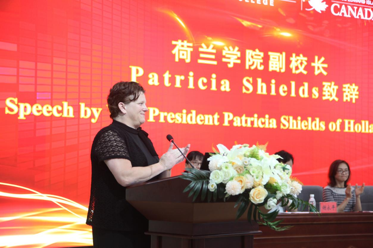 Patricia Shields在致辞中对我校领导及全体教职工在中加合作办学项目中的辛勤付出致以诚挚的谢意,对同学们从荷兰学院与湖北科技职业学院两所院校同时顺利毕业表示衷心的祝贺,向我校在与荷兰学院合作办学方面所表现出来的远见卓识和非凡勇气致以敬意。同时,她鼓励毕业生们勇于追寻自己的梦想,热切期待两校在未来建立更紧密、深入的合作关系。