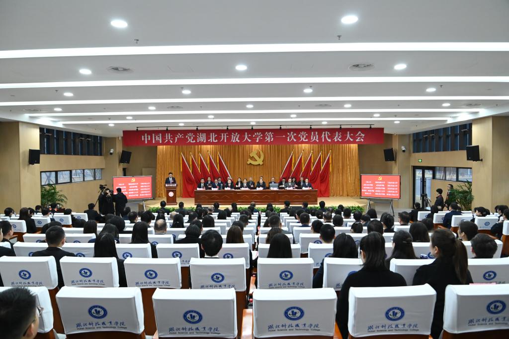 报告厅内气氛庄严热烈。主席台上方悬挂着“中国共产党湖北开放大学第一次党员代表大会”的会标,后幕正中是镰刀和锤头组成的党徽,10面鲜艳的红旗分列两侧,会场后方悬挂着“深化改革创新 加快融合发展 奋力谱写特色鲜明优势突出新型大学建设新篇章”的横幅。