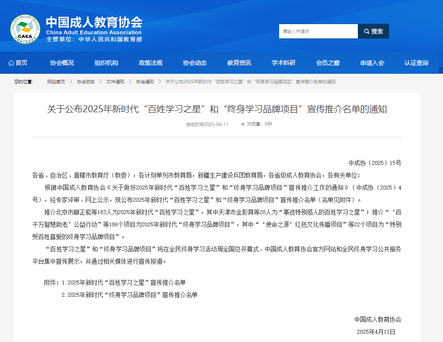 据悉,由教育部、中央宣传部等五部委主办的全国新时代“百姓学习之星”“终身学习品牌项目”评选推介活动,旨在激发全民学习活力,引导广大居民参与终身学习,增强广大群众学习获得感。
