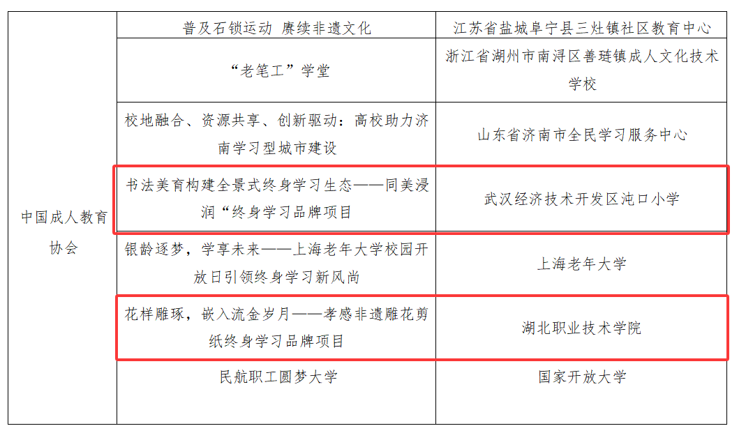 本网讯(通讯员 杨凡 文/图)4月11日,经过各省积极推荐与全国评选,备受瞩目的2025年全国新时代“百姓学习之星”“终身学习品牌项目”推介名单正式公布。此次评选中,我校组织申报代表湖北省参赛的项目再创佳绩,成绩斐然:共荣获全国“百姓学习之星”“终身学习品牌项目”共计12项,其中“事迹特别感人的百姓学习之星”“特别受百姓喜爱的终身学习品牌项目”各1项,获奖总数并列全国前三,“双特别”数并列全国第一。