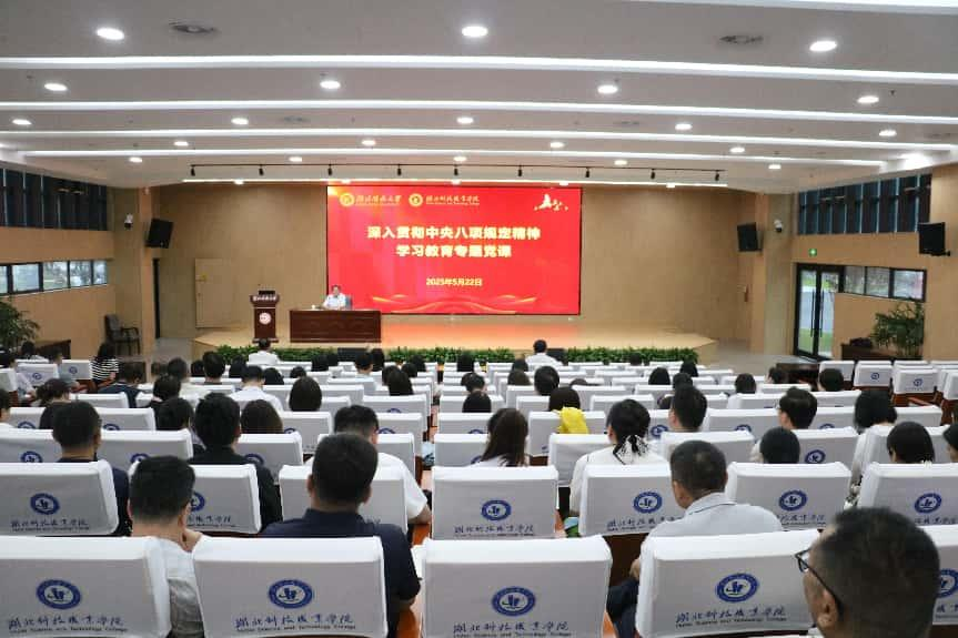 本网讯(通讯员 肖凌瑶/文 李贺刚/图)为深入学习贯彻习近平总书记关于加强党的作风建设的重要论述,扎实推进深入贯彻中央八项规定精神学习教育走深走实,5月22日,校党委书记钟毓宁讲授《贯彻落实中央八项规定精神 以作风建设实绩实效推动学校事业高质量发展》专题党课。全体校领导、中层领导干部及教师代表110余人参加,党课由校纪委书记丁华涛主持。