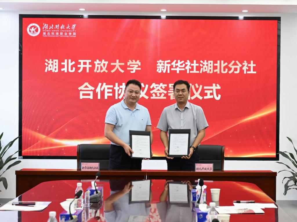 本网讯(通讯员 刘捷 文/图)6月17日,我校与新华通讯社湖北分社签署框架合作协议,新华社湖北分社分党组成员、副社长汪鹏,湖北开放大学党委常委、副校长周得力代表双方签署协议。校党委书记钟毓宁出席仪式并讲话。