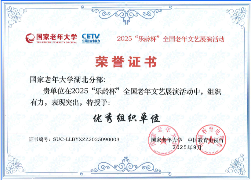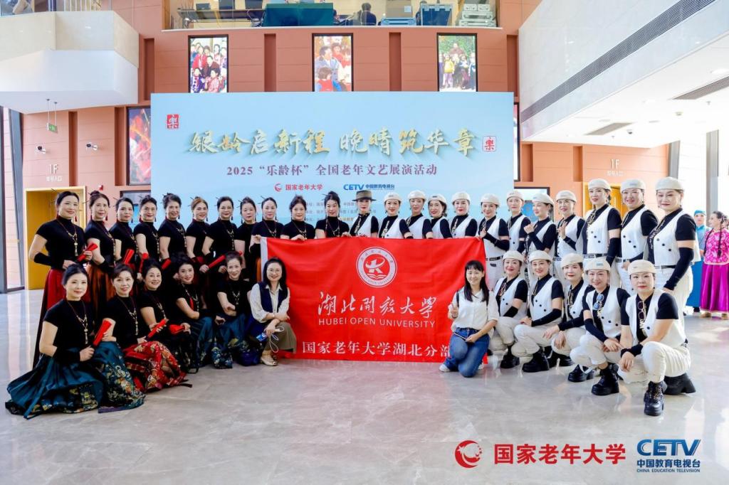 本网讯(通讯员:刘莺/文 马蓉/图)9月14日,由国家老年大学与中国教育电视台联合主办的2025“乐龄杯”全国老年文艺展演活动闭幕式在北京圆满落幕。我校受邀携获奖节目精彩亮相,在全国舞台上展现荆楚银龄的独特魅力与昂扬风采,并获评“优秀组织单位”。我校作为国家老年大学湖北分部,选送的两个节目斩获 “最佳风采节目” 称号,其指导教师也相应荣获 “最佳指导教师” 奖项。这些荣誉既是对国家老年大学湖北分部的肯定,也彰显湖北老年教育事业在高质量发展道路上稳步前行,再上新台阶。