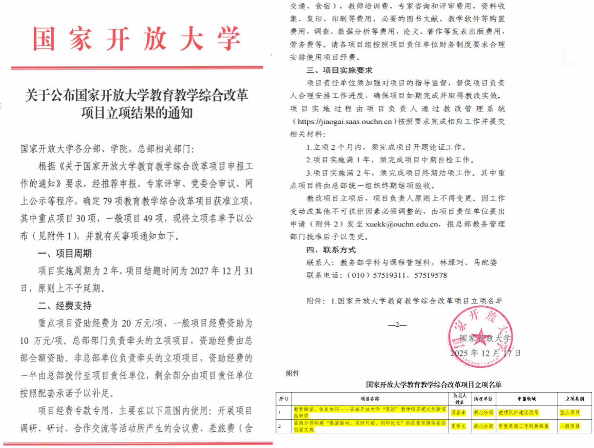 国家开放大学教育教学综合改革项目是深化开放教育内涵建设、引领终身教育高质量发展的重要载体,此次我校两项项目成功入选,是国家开放大学对我校改革探索工作的充分认可,也为我校进一步深化教育教学改革、提升人才培养质量注入了强劲动力。