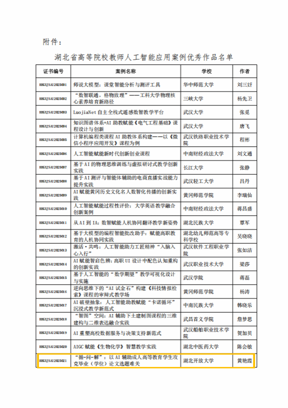 本网讯(通讯员 詹乐 文/图)12月23日,湖北省教育信息化发展中心、湖北省电化教育馆公布了全省高校教师人工智能应用案例征集活动评选结果。我校黄艳霞、夏春芬、杨凡、郭燕青等4名教师的案例成功入选。此次,全省共评出50个优秀案例,我校入选4项,入选数量位居全省第一。