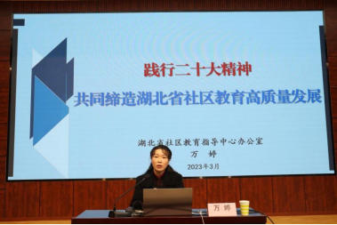 万婷作了题为《践行二十大精神共同缔造湖北省社区教育高质量发展》的报告。她从多个维度解析了社区教育,介绍了社区教育和社区发展在新时期的历史方位以及湖北省社区教育发展路径,安排了2023年工作任务。她强调,要聚焦服务湖北全民终身学习,完善湖北省终身教育体系,用“五化”探索社区教育新路径,全面推进我省社区教育工作高质量发展。