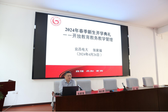 本网讯(通讯员 李宁/文 李杰/图)4月27日上午,宜昌市广播电视大学举行了2024年春季学期新生开学典礼。党委书记、校长王桃,纪委书记杨兴轩,副校长杨云堂,教务处主任张家福及招生处主任付炜出席此次活动,典礼由付炜主持,部分教师及校本部开放教育2024年春季学期新生参加了开学典礼。