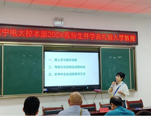 副主任程新珠介绍了电大历程、电大优势并提出,学生要端正学习态度,转换角色,充分利用业余时间自主学习;适应电大开放教育的学习方式,养成上网学习的习惯。
