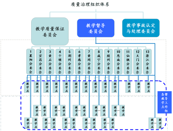 第二,建立质量指导及监控体系。建立教学质量保证委员会及分委会、教学督导委员会及二级单位教学督导工作组、教学事故认定与处理委员会。湖北开放大学教学质量保证委员会及分委会共有186名委员,其中省校23人,体系163人,均是市校、教学点校长、分管教学的副校长、质量管理部门或教务处处长等,该专家团队是体系“提质”的“智库”和“领航员”。教学质量保证委员会负责对湖北开放大学的教学工作、教学研究、教学改革、教学秩序、教学质量、教学管理等进行检查、督促、评价及指导。湖北开放大学教学督导委员会现有委员21人,具体负责教学督导工作,接受教学质量保证委员会的指导。校内二级教学单位和分部系统教学单位设有86个教学督导工作组,共有463名督导员,其中学生督导员86人。