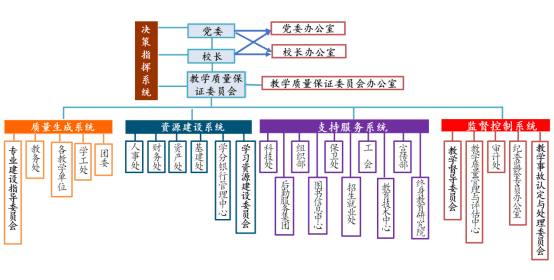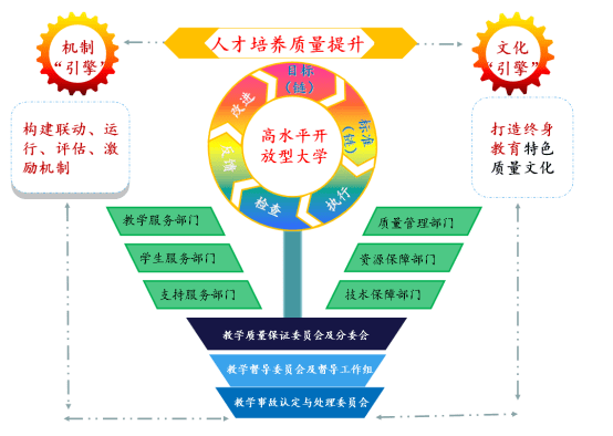 对应教学质量保证“五要素”:教学系统管理、教学过程控制、学习支持服务、数字化教学资源建设、一体化运作,湖北开放大学构建了决策指挥、质量生成、资源建设、支持服务、监督控制五大系统。