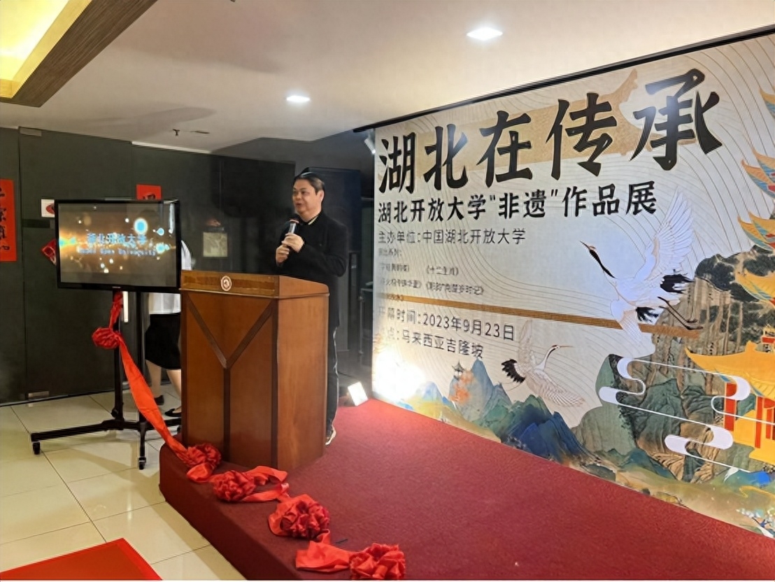 9月23日上午,湖北开放大学“湖北在传承”非物质文化遗产作品展首次在马来西亚吉隆坡成功举办。湖北开放大学党委书记刘义教授与马中总商会副会长拿督林恒毅先生分别致辞,马中友好协会秘书长、马来西亚海鸥集团董事经理陈景岗先生、马来西亚教育交流协会署理会长张林峰先生、马来西亚一带一路委员会秘书长梁志华先生、马来西亚纽富控股首席运营官CANDY WONG女士参与了开幕式。