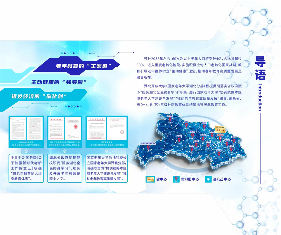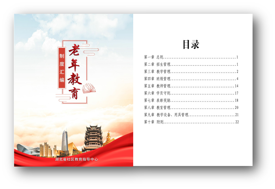 加强办学实体内涵建设。以校内老年教育省级示范基地为“试验田”开展老年教育管理制度和教学标准化研究。先后与湖北省标准化与质量研究院及相关业务主管部门研制出台了《湖北省老年教育管理制度》《湖北省老年教育基层办学建设标准》,组建专家教师团队出台《湖北省老年教育16门核心课程标准》。