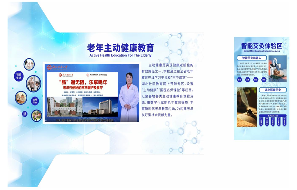 在课程开发建设上以老年人需求为中心,坚持教育性、时代性、创新性原则,进行适老化改造。重点打造主动健康、智能技术、非遗文化等系列专业课程,并联合湖北省中医院护理部、健康管理中心打造主动健康专业《老年人健康护理》等系列线上课程资源80个,面向全省社区老年教育体系,通过手机端开展同步直播,以线上线下相结合的方式开展“主动健康”中医系列课程和代际沟通公益讲座共10场,并进行健康科普及义诊等活动,服务民众健康福祉,助力健康中国建设。