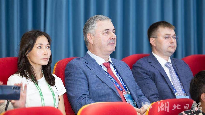 参会的国内外嘉宾们在湖北开放大学内听取学校数字教育成果汇报。