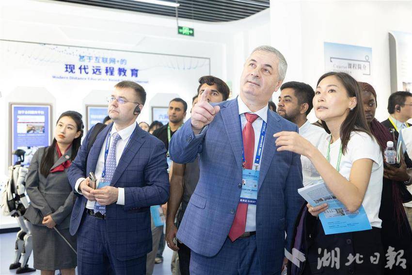 参会的国内外嘉宾们在湖北开放大学内参观走访。