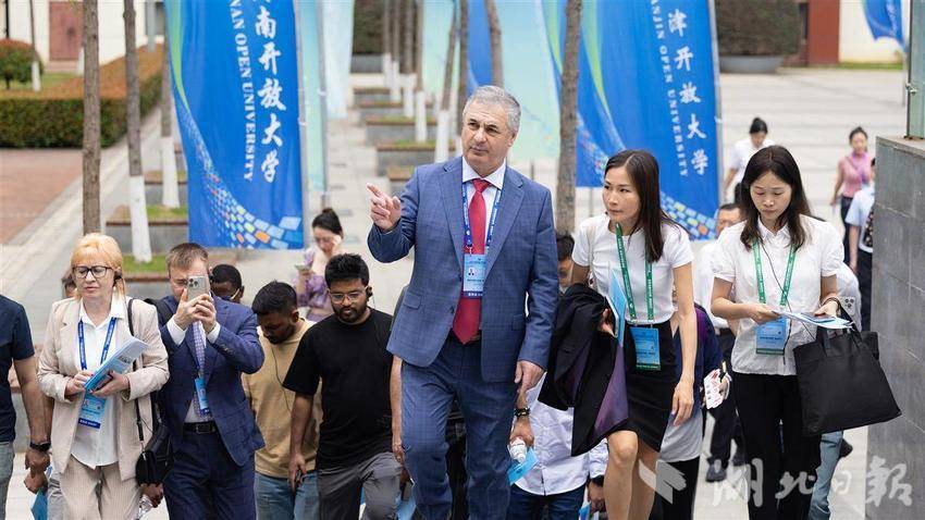 参会的国内外嘉宾们行走在湖北开放大学内。