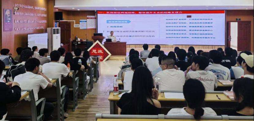 丁华涛带领学生系统回顾了习近平总书记六次考察湖北的殷切嘱托,以习近平总书记对湖北“建成支点、走在前列、谱写新篇”的战略擘画为引,从光电子通信的国内领跑到三峡智能监测系统的动态感知,从“武汉云”的算力跃升到“数字长江”的生态守护,一组组震撼数据勾勒出荆楚大地的奋进图景。他强调,这些成就是湖北人民学习贯彻习近平总书记重要讲话精神的生动实践,离不开科技创新的驱动、产业转型的突破和生态保护的坚守,更离不开一代代荆楚儿女的接续奋斗。青年学子要从湖北答卷中汲取力量,坚定信心、勇担使命。